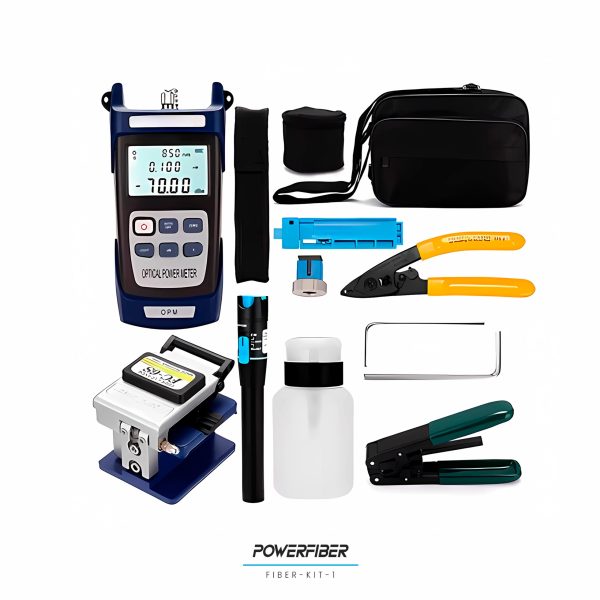 Kit de herramientas para fibra óptica FTTH, para profesionales de telecomunicaciones. Diseñado para facilitar la instalación y el mantenimiento de redes de fibra óptica, viene en un práctico maletín de transporte, asegurando eficiencia y organización en cada proyecto.